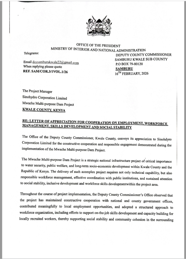 近日,肯尼亚夸莱县向中国电建穆瓦驰多用途大坝项目部发来表扬信,对项目在就业管理、技能培养和维护社会稳定等方面所做出的积极贡献给予充分肯定。 来信指出,穆瓦驰多用途大坝项目是夸莱县乃至肯尼亚重要的国家基础设施工程,对保障水资源安全、改善民生福祉和促进区域经济社会长期发展具有重要意义。项目在实施过程中,不仅展现了过硬的工程管理和技术能力,还高度重视本地劳动力管理、公共事务协调和社会责任履行,在保障工程顺利推进的同时,有力促进了当地就业和社区和谐稳定。希望项目团队在后续建设阶段和未来相关项目中,继续加强与政府部门的协同配合,进一步扩大本地就业规模,持续推进技能培养工作,维护稳定、和谐的劳动关系,以高标准履约助力地区可持续发展。 | ||||||||||