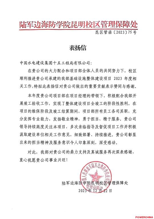 信中指出,2023年,JR昆明校区项目在项目经理的带领下,积极配合业主单位开展竣工验收工作,实现了整体建设项目全竣工的阶段性胜利。在项目的维保阶段及竣工结算期间,项目部所有员工各司其职,充分发挥专业能力,发扬敬业精神,勇于担当、精于服务。公司领导持续高度关注JR昆明校区项目,多次亲临指导及督促项目工作并积极汲取各方意见,细致部署、持续推进。业主单位肯定了项目部专业敬业、担当作为的精神,对项目部积极推进建设任务所做出的卓越贡献予以表扬,对公司的鼎力支持及真诚服务表示感谢。