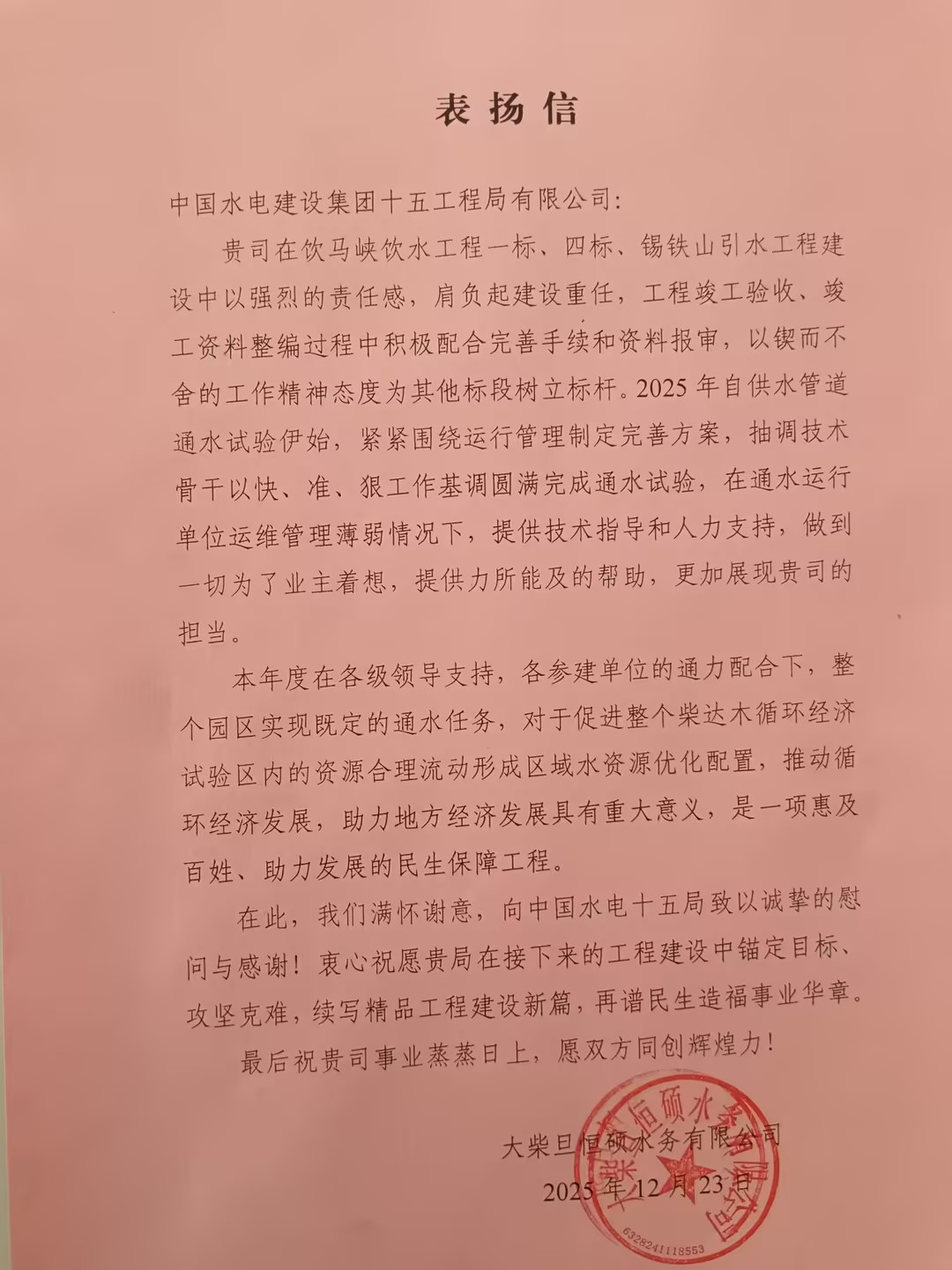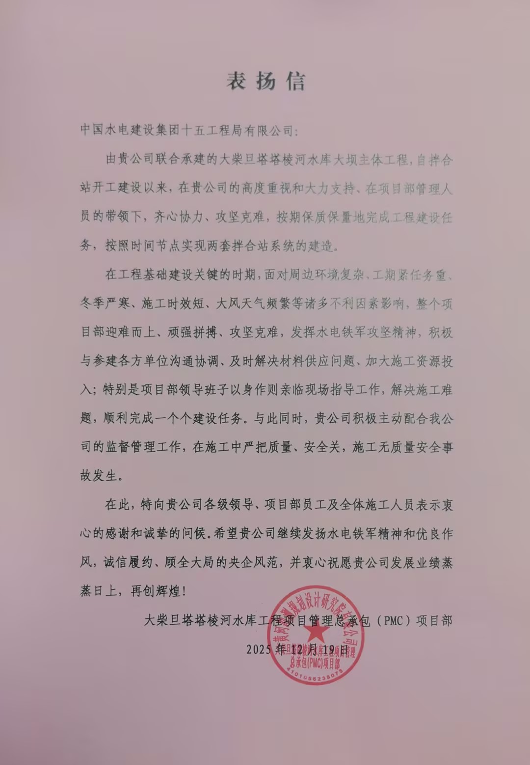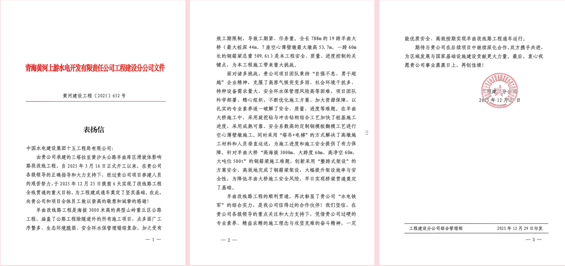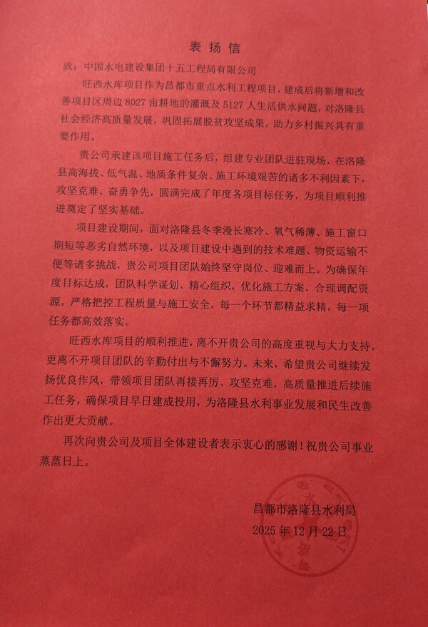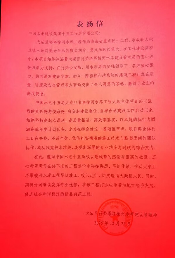 近期,一公司多个项目收到业主等单位送来的表扬信,对项目团队攻坚克难、奋勇争先,圆满完成年度各项目标任务给予肯定,并致以衷心感谢。 2025年12月22日,西藏昌都市洛隆县旺西水库工程项目收到业主单位洛隆县水利局送来的表扬信,信中指出,作为昌都市重点水利工程,旺西水库是洛隆县巩固脱贫成果、助力乡村振兴的关键项目。面对多重施工挑战,项目团队科学谋划、精心组织,优化施工方案、精准调配资源、严控质量安全,将“精益求精”贯穿施工全过程,为项目后续推进打牢坚实基础。 近日,青海大柴旦项目部接连收到来自大柴旦行委塔塔棱河水库建设管理局、大柴旦恒硕水务有限公司和大柴旦塔塔棱河水库工程项目管理总承包(PMC)项目部的三封表扬信,信中充分肯定项目团队在饮马峡饮水工程、锡铁山引水工程及塔塔棱河水库工程建设中的优异表现,始终坚持高标准、严要求,以高度责任感和专业精神,齐心协力、攻坚克难,圆满完成年度计划任务,彰显出央企实力与责任担当。 近日,青海羊曲改线路项目接连收到青海省交通运输综合行政执法湟源干线支队共和大队和青海黄河上游水电开发有限责任公司工程建设分公司发来的感谢信和表扬信,信中对项目建设团队提前6天实现三塔拉至黄沙头公路羊曲水电站库区滑坡体影响路段改线工程全线贯通表示热烈祝贺,对在G572国道羊曲段日常运维、抢险救援等工作中的辛勤付出与责任担当给予高度赞誉。 2026年1月5日,湖北监利排水管网工程项目部收到监利市容城镇国庆社区送来的 “精工细作建管网 攻坚克难惠民生” 锦旗,对项目团队秉持“民生为先、质量为本”的理念,攻坚克难、勤耕不辍,在保障工程质量与施工效率的同时,针对性解决道路损毁等民生问题,向全体参建人员致以诚挚感谢。下一步,项目团队将坚持实干作答,高标准、严要求推进工程建设,不负当地居民们的重托与期待。 | ||||||||||