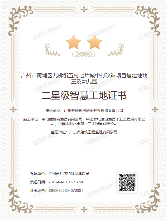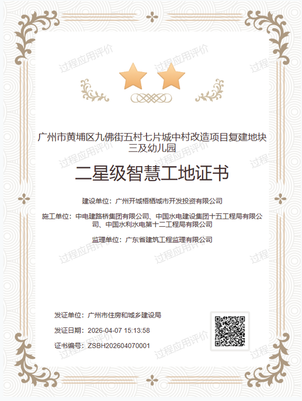 2026年4月7日,公司承建的广州市五村七片城中村改造(地块三)项目通过广州市住房和城乡建设局智慧工地综合评审,获评广州市二星级智慧工地。 项目自开工以来,始终坚持科技赋能、精细管理、标准化建设、优质高效、安全环保的建设理念,全面推进工地数字化、智能化升级改造。依托 AI 智能识别、无人机巡检等技术手段,运用一体化智慧工地管理平台,实现人员实名制管理、机械设备智能监控、施工现场安全预警、环境在线监测、塔吊可视化监控及危大工程全过程管控。通过数据互联互通、智能协同作业和全过程闭环管理,持续提升项目建设精细化、标准化、智能化管理水平,有力推动项目智能信息化建设高效落地。 五村七片城中村改造项目位于永九快速路旁、莲塘村和重岗村交界处,总建筑面积约16.89万平方米,包含6栋高层住宅地下室车库、商业、公建配套等,为一类高层住宅。建成后,沿街商业将进一步汇聚人流、物流,推动周边产业繁荣,为黄埔区城市可持续发展注入新动力。 | ||||||||||