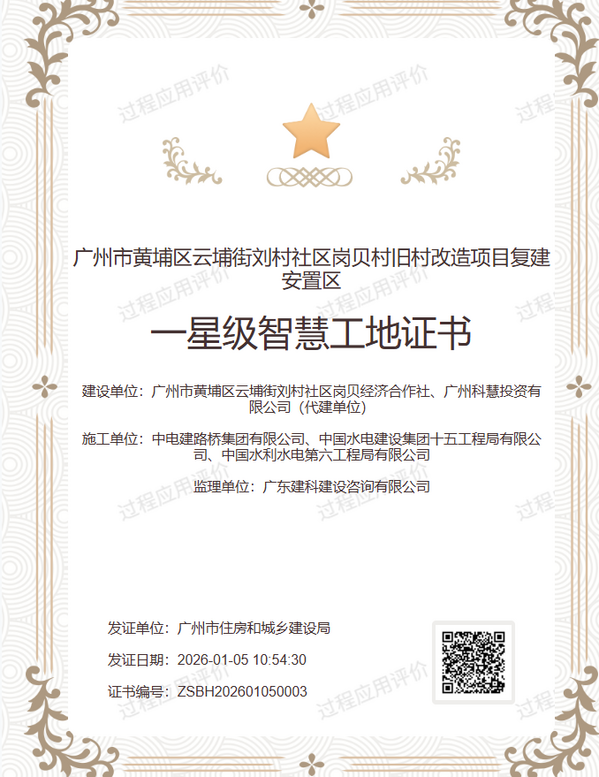 1月5日,公司承建的岗贝村旧村改造项目获广州市住房和城乡建设局核发的“一星级智慧工地证书”,标志着项目数字化施工与智慧管控成果获市级权威认可。 项目以“数字赋能全流程”为核心,构建覆盖安全、质量、环保、进度的智慧化管理体系。通过采用塔吊吊钩安全管理系统、施工升降机安全监控管理系统、扬尘噪声监测系统等信息化系统,构建了智慧安防体系,实现从“被动整改”到“主动预防”、从“经验管理”到“数据决策”的跨越式升级。此次认证不仅是对现阶段管理成果的肯定,也为项目后续高标准推进奠定了技术基础。项目团队将继续优化智慧工地系统,为同类项目智慧工地建设提供可复制的样板经验。 广州岗贝村旧村改造项目位于广州市黄埔区南部,总建筑面积约21.08万平方米,含11栋住宅、地下室、商业、物业及教育等配套设施。项目建成后,对于改善当地村民居住环境具有重要意义。 | ||||||||||