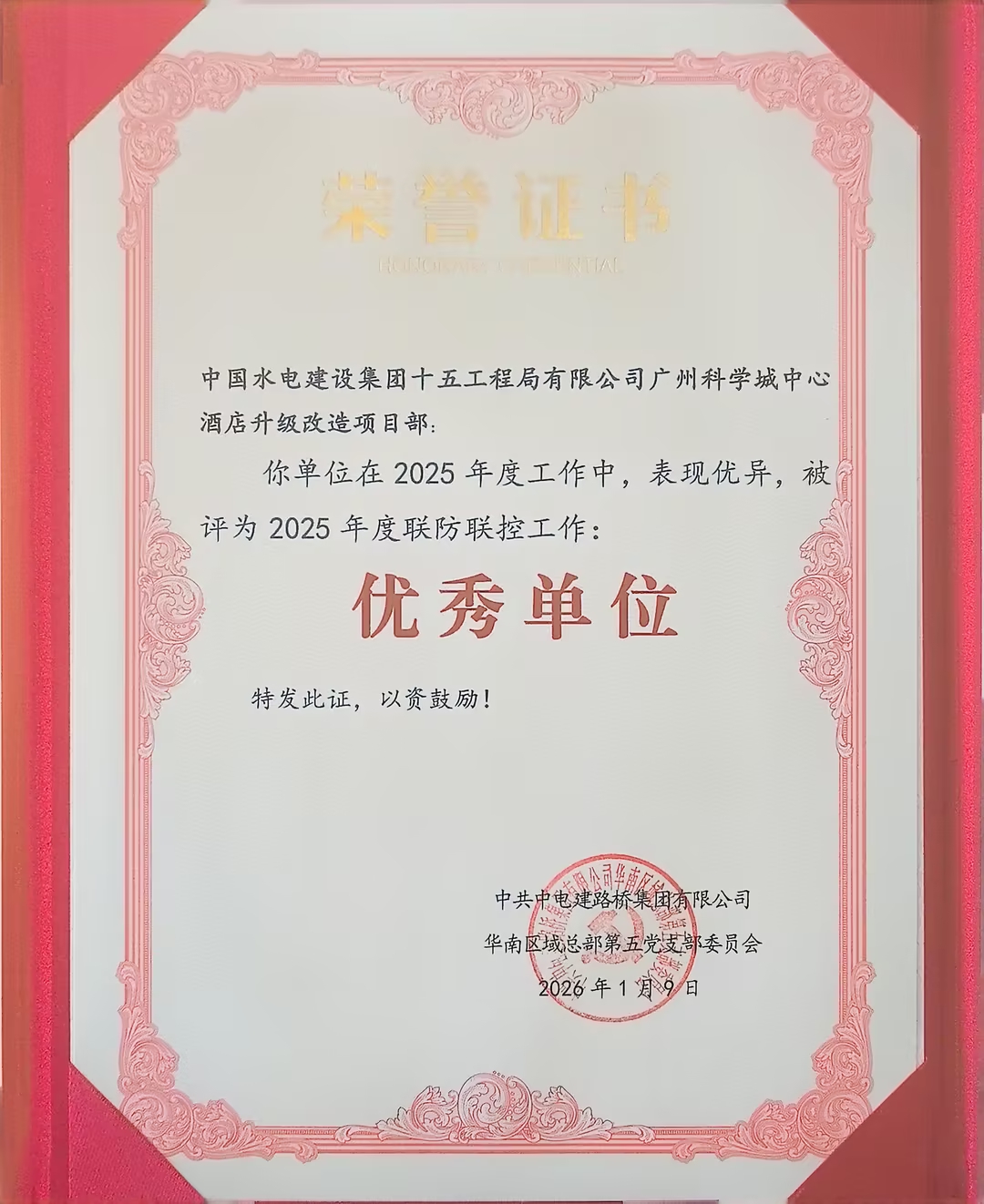 1月9日,在中电建路桥华南区域总部第五党支部项目群召开的2025年度项目廉洁风险联防联控工作总结会暨2026年度工作推进会上,公司承建的广州科学城酒店项目荣获“优秀单位”称号,广州长平旧改项目部和广州水西旧改项目部2位同志获评“先进个人”。 此次表彰是总包单位对建筑公司广州片区项目群在项目建设过程中坚守廉洁底线、践行联防联控要求的充分肯定。自参与相关项目建设以来,广州片区项目群始终秉持“廉洁共建、风险协防”理念,积极配合项目群总承包部各项工作部署,在科学城酒店项目建设中严控廉洁风险,保障项目合规推进;广州长平旧改项目部和广州水西旧改项目部两位同志立足岗位,履职尽责,以实际行动助力项目廉洁建设与高效推进。 下一步,建筑公司广州片区项目群将珍惜荣誉、再接再厉,持续深化廉洁项目建设,严格落实联防联控机制,充分发挥先进典型的示范引领作用,为项目群高质量建设、守护风清气正的项目环境贡献更大力量。 | ||||||||||