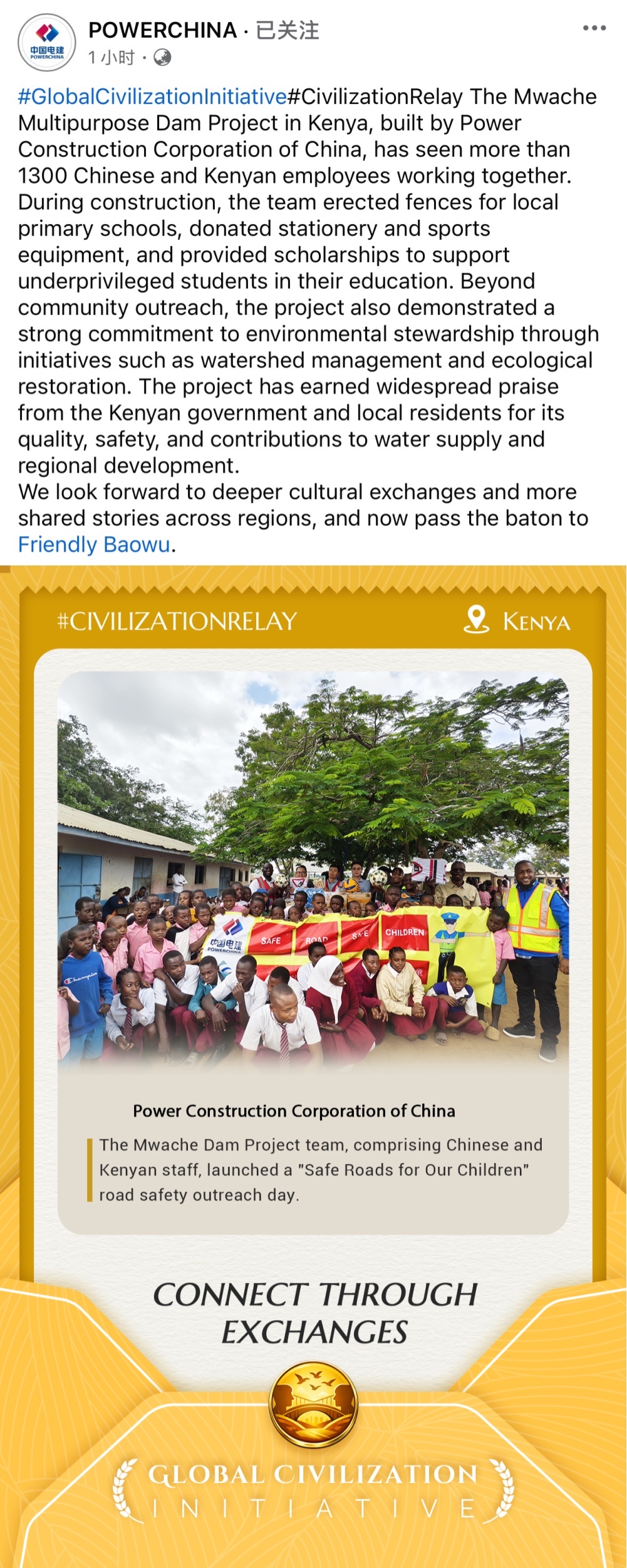 3月24日,在国务院国资委举办的“全球文明倡议”云接力传播活动中,中国电建肯尼亚穆瓦驰大坝项目“校园交通安全日”活动作为“加强国际人文交流合作”版块的典型案例精彩亮相,集中展现了中央企业在促进中外文明交流互鉴、深化民心相通方面的生动实践与积极成效。 项目建设过程中,1300余名中肯员工并肩作业,在共同奋斗中加深理解、增进友谊。从施工一线到日常生活,语言与文化的差异在合作中不断被拉近,凝聚成团结协作的强大合力。 在保障工程高质量推进的同时,项目团队积极融入当地社区,持续开展形式多样的公益活动:为周边小学修筑安全围栏,改善校园环境;捐赠文具和体育器材,丰富孩子们的学习与课余生活;设立奖学金项目,帮助困难学生完成学业。这些看得见、摸得着的举措,让项目真正走进当地民众心中,也让“共建共享”的理念落地生根。 与此同时,项目始终坚持绿色发展理念,注重生态保护与可持续发展,积极推进流域治理与生态修复工作,在建设与保护之间实现良性平衡,展现了中国企业负责任的国际形象。 凭借过硬的工程质量、严格的安全管理以及在供水保障和区域发展中的积极贡献,穆瓦驰多用途大坝项目赢得了肯尼亚政府和当地社会的广泛认可与高度评价。项目不仅改善了当地基础设施条件,更成为连接中肯人民情感的重要纽带。 以工程为桥,以合作为媒。未来,项目团队将继续深化与当地社会的交流互动,拓展人文合作的广度与深度,在推动基础设施建设的同时,讲好更多跨越山海、温暖人心的合作故事,为促进不同文明交流互鉴、实现合作共赢贡献更多力量。 | ||||||||||