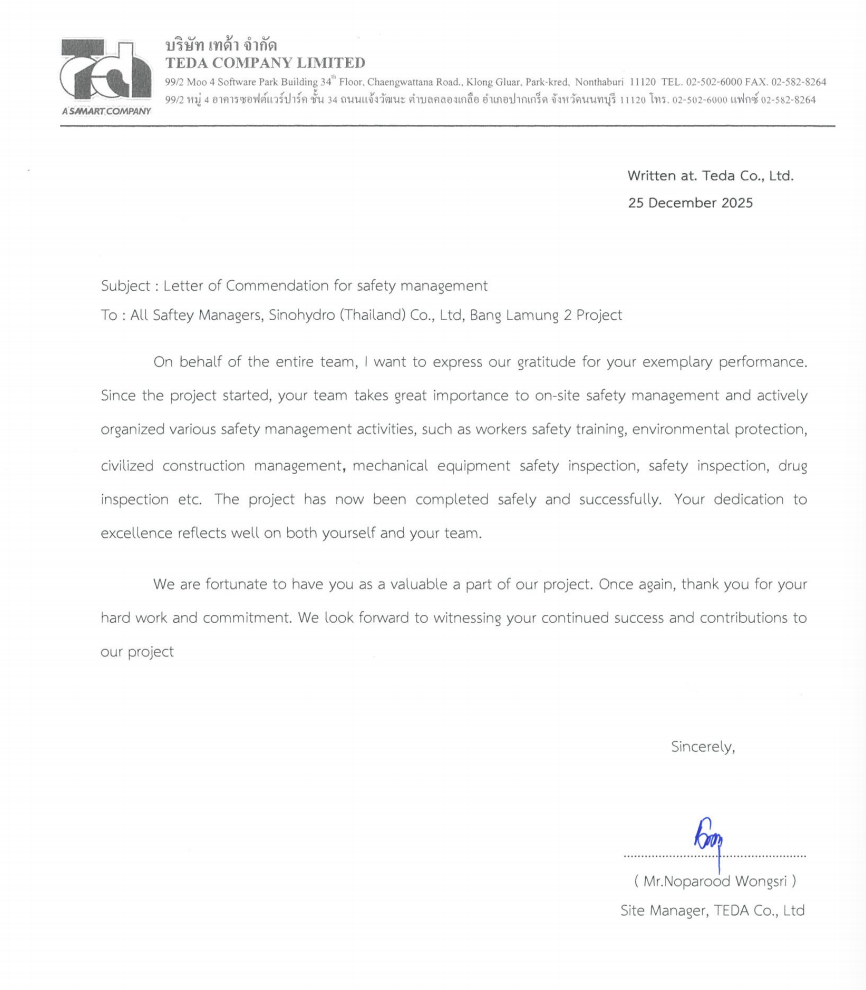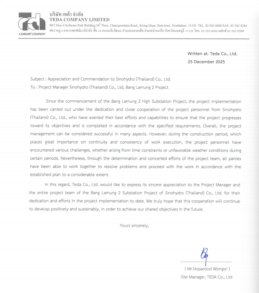 近日,公司承建的泰国邦拉蒙2变电站项目先后收到业主单位泰国输变电工程公司(TEDA)发来的履约感谢信和安全管理表扬信,对项目团队在合同履约、工程质量、安全管理及专业协作等方面的出色表现给予高度肯定,并对项目顺利推进表示诚挚感谢。 信中指出,项目实施过程中,项目团队严格履行合同约定,科学组织施工,合理统筹资源配置,面对工期紧、协调事项多等实际困难,始终保持高效执行力和专业精神,确保各项关键节点目标如期实现,为项目按期交付奠定了坚实基础。严格执行当地法律法规及安全管理要求,持续开展安全教育培训和风险辨识,强化作业过程监督检查,实现了施工期间安全形势持续稳定,有效保障了人员和设备安全。 下一步,项目团队将以此为契机,持续坚持高标准履约、高水平安全管理和高质量工程建设,不断提升国际工程精细化管理水平,为深化中泰电力领域合作、树立中国电建良好海外形象贡献力量。 | ||||||||||