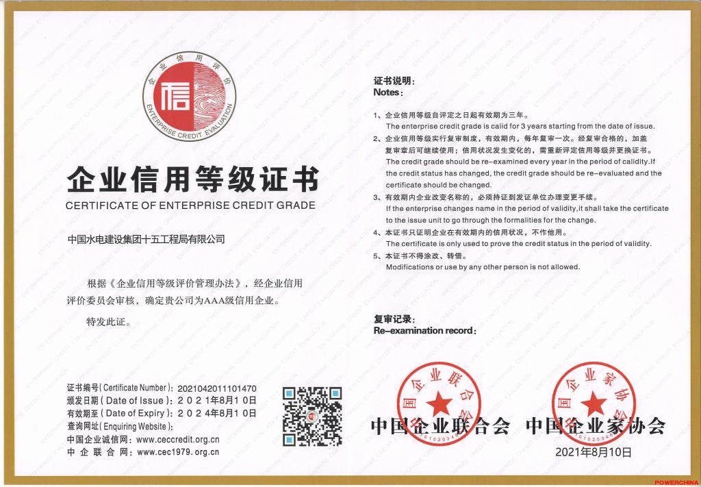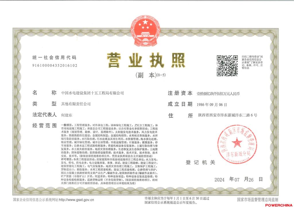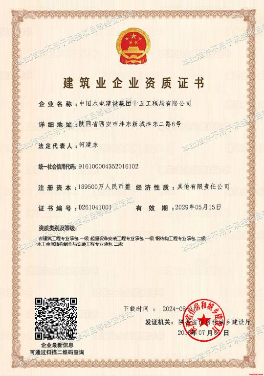 中国水电建设集团十五工程局有限公司注册资本18.95亿元,具备水利水电工程施工总承包特级资质,公路工程、建筑工程、市政公用工程、机电工程、电力工程施工总承包壹级资质,桥梁、隧道、公路路基、起重设备安装、古建筑工程专业承包壹级资质,钢结构工程专业承包、水工金属结构制作与安装工程专业承包二级资质,工程设计水利行业甲级资质。