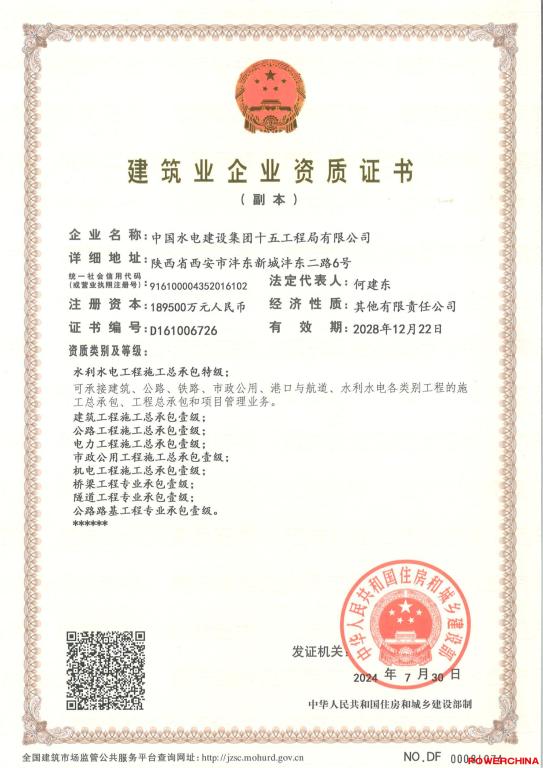 中国水电建设集团十五工程局有限公司注册资本18.95亿元,具备水利水电工程施工总承包特级资质,公路工程、建筑工程、市政公用工程、机电工程、电力工程施工总承包壹级资质,桥梁、隧道、公路路基、起重设备安装、古建筑工程专业承包壹级资质,钢结构工程专业承包、水工金属结构制作与安装工程专业承包二级资质,工程设计水利行业甲级资质。