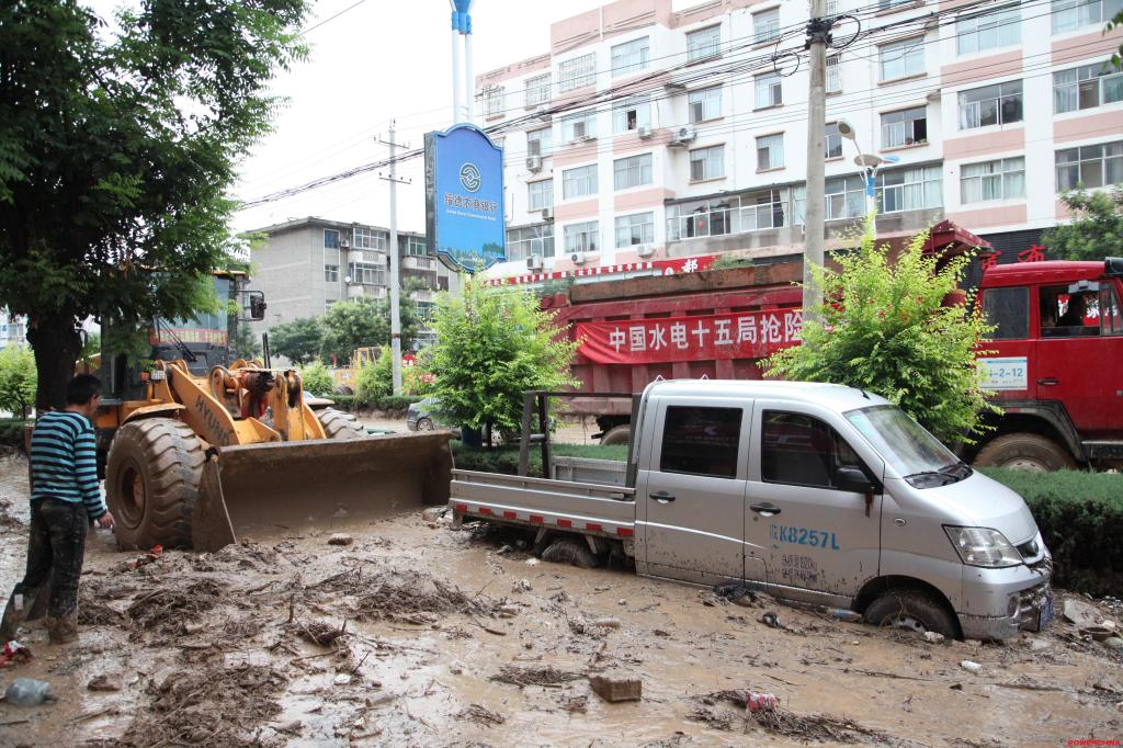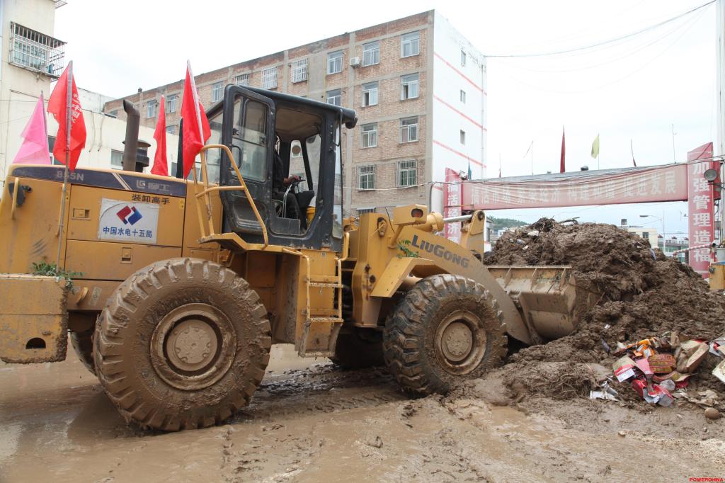 由于绥德县民州农副产品批发市场周围地势低洼且道路狭窄,此次受灾较为严重,堆积起的淤泥堆足有3米高,工作量大,并且很不利于运输。中国水电十五局抢险突击队立即协调出1辆装载机、4辆自卸车,火速增援。